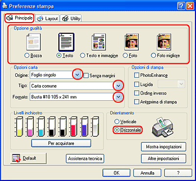 Il modo personalizzato Economy e l'impostazione Economy presente in Qualità nella finestra di dialogo delle Altre Impostazioni, non sono disponibili quando si stampa su buste.