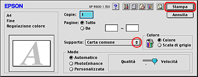 Selezionare Stylus Photo R800 come impostazione di Stampante, quindi effettuare le impostazioni di Copie & Pagine.