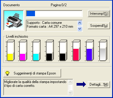 La finestra di dialogo della barra di avanzamento appare automaticamente quando si invia un lavoro di stampa alla stampante. Da questa finestra di dialogo è possibile controllare la quantità di inchiostro rimanente.