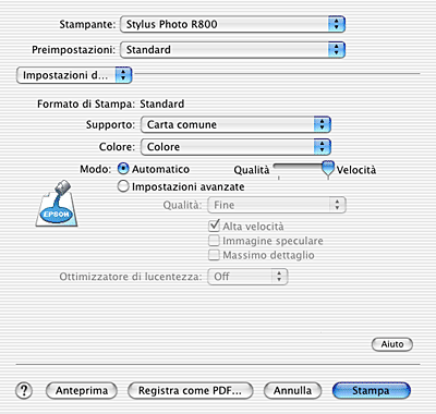 Il modo più semplice e rapido per iniziare a stampare. Il software della stampante esegue automaticamente ulteriori impostazioni dettagliate in base alle impostazioni correnti di Supporto e Colore.