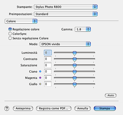 Selezionare Colore dal menu a comparsa per controllare i metodi di regolazione e di corrispondenza del colore forniti con il driver della stampante. Usare queste impostazioni per sperimentare nuove idee di stampa oppure per mettere a punto una serie di impostazioni di stampa adatte alle proprie esigenze specifiche.