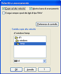 Selezionare la casella di controllo Copie ad alta velocità per stampare più velocemente più copie dello stesso documento. La stampa viene velocizzata sfruttando lo spazio sul disco rigido come cache quando si stampano più copie dello stesso documento.