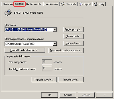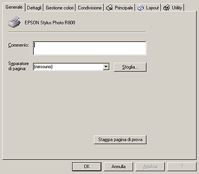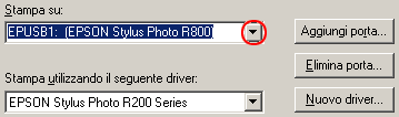 Se EPUSBX: (EPSON Stylus Photo R800) appare nell'elenco Stampa su, significa che il driver di stampa USB e il software della stampante sono installati in modo corretto. Se non viene visualizzata la porta corretta, procedere al passaggio successivo.