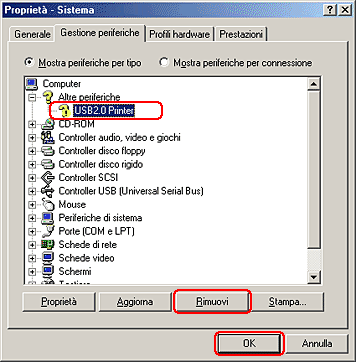 In Altre periferiche, selezionare Stampante USB o EPSON Stylus Photo R800 e fare clic su Rimuovi. Quindi, fare clic su OK.