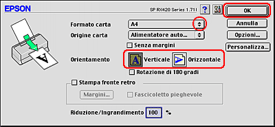 Effettuare le impostazioni appropriate di Dimensioni e Orientamento.