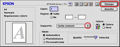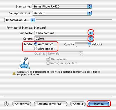 Effettuare le impostazioni appropriate di Supporto, Inchiostro e Modo. Per informazioni dettagliate su Impostazioni di stampa, vedere la guida in linea.