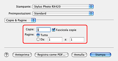 Far coincidere l'impostazione di Stampante con l'impostazione di Formato per effettuata nella finestra di dialogo Formato di Stampa al passaggio 3. Quindi, effettuare le impostazioni di Copie & Pagine.