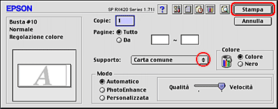 Selezionare Stylus Photo RX420 come impostazione di Stampante, quindi effettuare le impostazioni di Copie & Pagine.