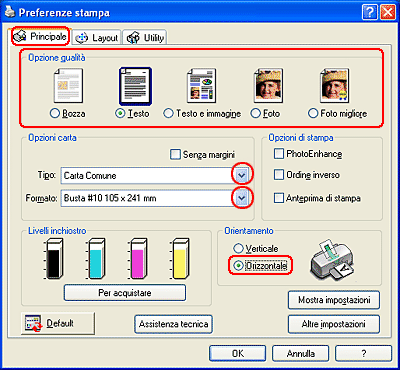 Selezionare il formato busta appropriato come impostazione di Dimensioni.