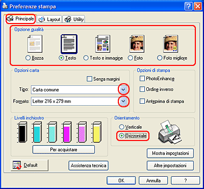 Selezionare Carta comune come impostazione di Supporto, quindi effettuare le impostazioni appropriate di Inchiostro e Modo. Per informazioni dettagliate, vedere la Guida in linea.