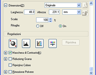 Specificare le dimensioni in uscita dell'immagine acquisita in Dimensioni ed effettuare delle regolazioni con gli strumenti di regolazione della qualità dell'immagine, se necessario.
