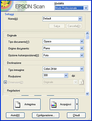Avviare EPSON Scan e quindi selezionare il modo Professionale. Per informazioni dettagliate sulla selezione del modo di scansione, vedere Modifica del modo di scansione.