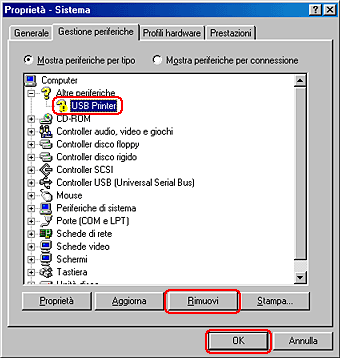 In Altre periferiche, selezionare Stampante USB o EPSON Stylus Photo RX500 e fare clic su Rimuovi. Quindi, fare clic su OK.