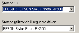 Se EPUSBX: (EPSON Stylus Photo RX500) appare nella casella di riepilogo Stampa su, significa che il driver della stampante USB e il software della stampante sono installati in modo corretto. Se non viene visualizzata la porta corretta, procedere al passaggio successivo.