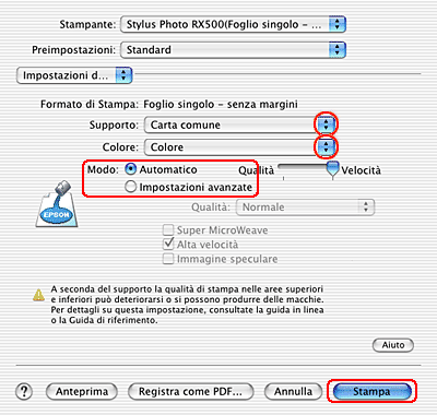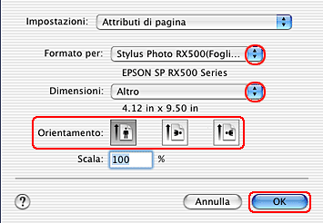 Selezionare Stylus Photo RX500 (Alimentatore - Margini zero) come impostazione di Formato per.