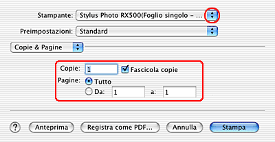 Selezionare Stylus Photo RX500 (Alimentatore - Margini zero) come impostazione di Stampante, quindi effettuare le impostazioni di Copie & Pagine.