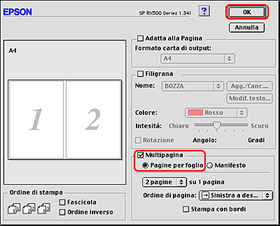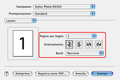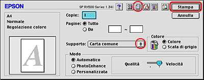 ![]() | Selezionare Stylus Photo RX500 come impostazione di Stampante. |