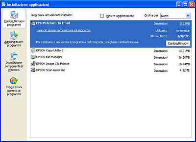 Fare clic su EPSON Attach to Email nell’elenco dei programmi correntemente installati e fare clic su Cambia/Rimuovi (Windows XP o 2000) o su Aggiungi/Rimuovi (Windows Me o 98).