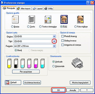 Selezionare CD/DVD o CD/DVD Superficie Premium come impostazione di Tipo.