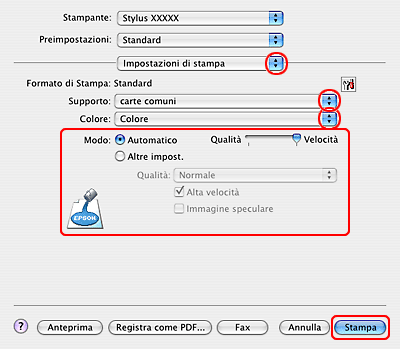 Definire le impostazioni appropriate di Supporto, Colore e Modo. Per informazioni dettagliate, vedere la Guida in linea di Impostazioni di stampa.