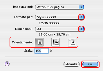 Definire le impostazioni appropriate di Formato carta e Orientamento. È inoltre possibile definire un formato carta personalizzato. Per informazioni dettagliate, consultare la Guida in linea.