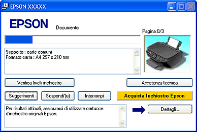 SuggerimentiNella casella di testo della finestra della barra di avanzamento vengono visualizzati suggerimenti per sfruttare al meglio il driver della stampante Epson. Ogni 15 secondi viene visualizzato un nuovo suggerimento. Per informazioni dettagliate sul suggerimento visualizzato nella finestra, fare clic sul pulsante Dettagli.