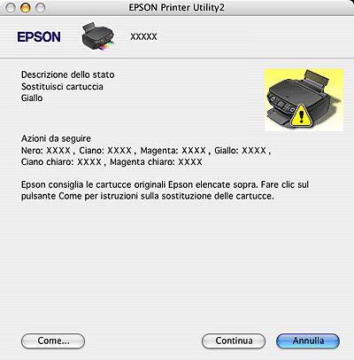 ![]() Quando l'inchiostro è scarso o esaurito, appare il pulsante Come. Fare clic su Come ed EPSON StatusMonitor guiderà l'utente nella procedura di sostituzione della cartuccia d'inchiostro.