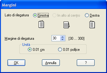 Selezionare cm o pollice come impostazione di Unità. Quindi, specificare la larghezza del margine di rilegatura. È possibile immettere larghezze comprese tra 0,3 cm e 3 cm oppure tra 0,12 pollici e 1,18 pollici.