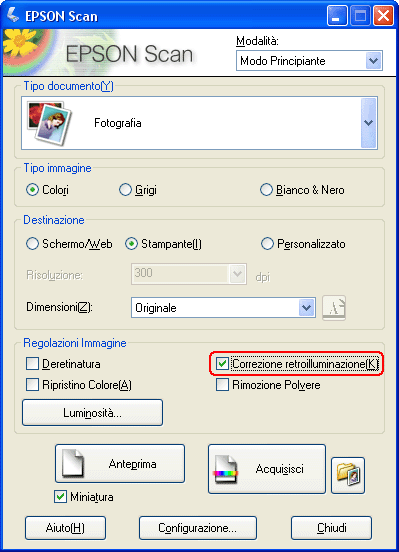 Per correggere le foto retroilluminate utilizzando Epson Scan, effettuare i passaggi che seguono.