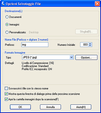 Se la scansione è stata avviata eseguendo Epson Scan come programma autonomo nel Modo Principiante o Professionale, verrà visualizzata la finestra Opzioni Salvataggio File. Questa finestra consente di selezionare il nome e la destinazione dei file di scansione salvati. Per informazioni dettagliate, vedere Selezione delle Opzioni Salvataggio File.