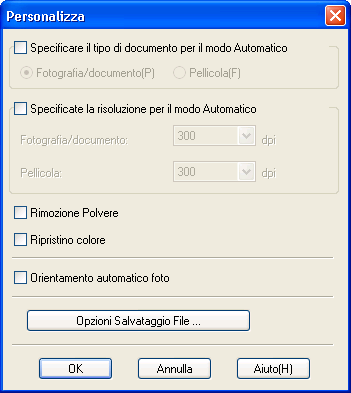 Il Modo Automatico è consigliato quando è necessario acquisire documenti o foto con le dimensioni originali (100%) e non è necessario creare un'anteprima delle immagini prima della scansione. È possibile ripristinare i colori sbiaditi o rimuovere i segni della polvere facendo clic sul pulsante Personalizza. Per istruzioni sulla scansione con questa modalità, vedere Uso del Modo Automatico.