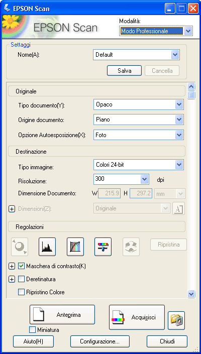 Per definire le impostazioni di base per un documento o una foto in Epson Scan, effettuare i passaggi che seguono: