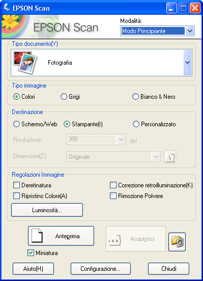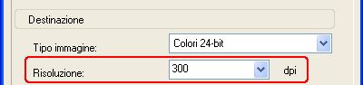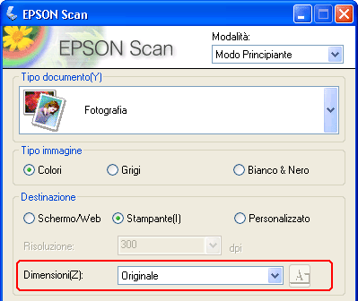 Se si acquisiscono le immagini al 100% delle dimensioni o proporzione inferiore e non verranno ingrandite in seguito, è possibile mantenere le impostazioni di Risoluzione selezionate da Epson Scan in base alle impostazioni della Destinazione (solo Modo Principiante).
