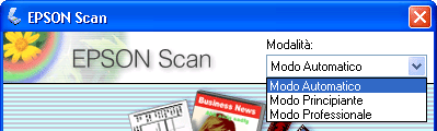 Modifica della modalità di scansionePer modificare la modalità di scansione, fare clic sulla freccia nella casella di riepilogo Modalità nell'angolo superiore destro della finestra di Epson Scan. Selezionare quindi la modalità che si desidera utilizzare dall'elenco visualizzato.