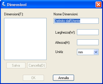 ![]() Digitare un nome per le dimensioni personalizzate, immettere le dimensioni, fare clic sul pulsante Salva, quindi fare clic su OK. Le nuove dimensioni verranno visualizzate nell'elenco Dimensioni.