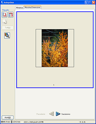 Il metodo di anteprima Normale consente di visualizzare l'intera immagine di anteprima e gli effetti delle impostazioni effettuate; consente inoltre di effettuare ulteriori regolazioni dell'immagine. È inoltre possibile utilizzare delle cornici intermittenti per la scansione di parti specifiche di un'immagine. Per informazioni dettagliate sulle cornici intermittenti, vedere Uso delle cornici intermittenti.
