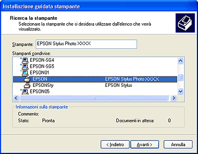 A seconda del sistema operativo e della configurazione del computer al quale questo prodotto è collegato, l'Installazione guidata stampante potrà richiedere di installare il driver della stampante dal CD del software della stampante. In questo caso, fare clic sul pulsante Disco driver e seguire le istruzioni visualizzate sullo schermo.
