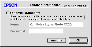 Utilizzare l'impostazione di condivisione stampante, presente come funzione standard in Mac OS X 10.2 o versione successiva. Questa funzione non risulta disponibile con Mac OS X 10.1.