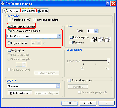 Fare clic sulla scheda Layout, quindi selezionare la casella di controllo Stampa proporzionale. Per modificare le dimensioni del documento, è possibile selezionare le impostazioni che seguono.