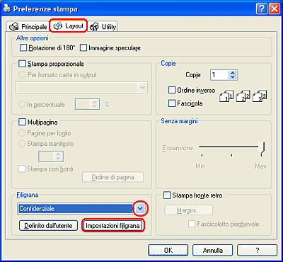 Selezionare la casella di controllo Filigrana della finestra di dialogo Layout, quindi selezionare la filigrana desiderata dall'elenco Nome.