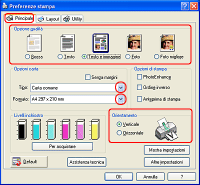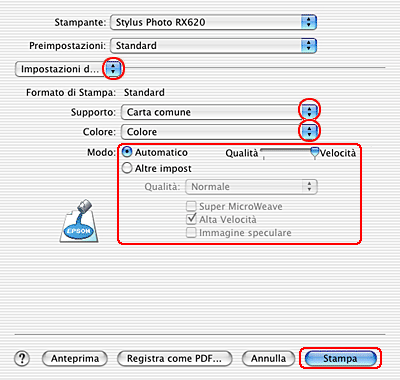 Effettuare le impostazioni appropriate di Supporto, Inchiostro e Modo. Per informazioni dettagliate su Impostazioni di stampa, vedere la guida in linea.