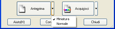 Fare clic su Anteprima nel modo Principiante o Professionale per avviare la scansione preliminare e visualizzare in anteprima l'immagine. A seconda della modalità impostata e delle impostazioni di Tipo documento, a destra del pulsante Anteprima viene visualizzata una piccola freccia che consente di selezionare un metodo di anteprima. Per cambiare il metodo di anteprima, fare clic sulla freccia e selezionare Miniatura o Normale.