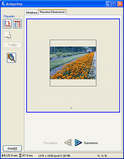 Il metodo di anteprima Normale consente di visualizzare l'intera immagine di anteprima e gli effetti delle impostazioni effettuate; consente inoltre di effettuare ulteriori regolazioni dell'immagine. È inoltre possibile utilizzare delle cornici intermittenti per la scansione di parti specifiche di un'immagine. Per informazioni dettagliate sulle cornici intermittenti, vedere Uso delle cornici intermittenti.