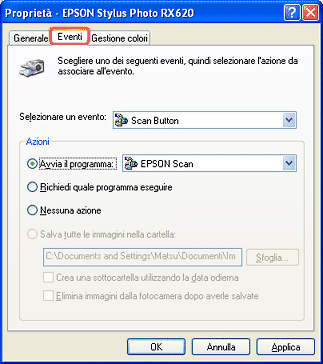 Se è necessario disabilitare gli Eventi scanner, selezionare Nessuna azione nella finestra di dialogo Proprietà.