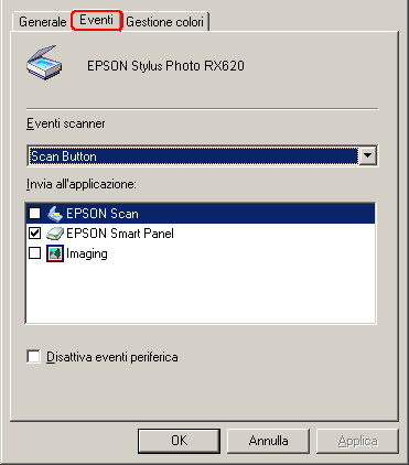 Se è necessario disabilitare gli Eventi scanner, selezionare la casella di controllo Disattiva eventi periferica nella finestra di dialogo Proprietà dello scanner.