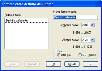 Selezionare Definito dall'utente come impostazione di Formato. Viene visualizzata la finestra di dialogo Formato carta definito dall'utente.