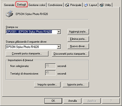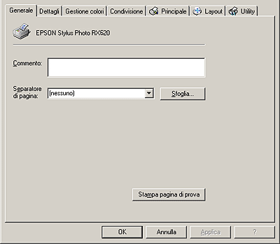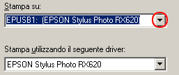 Se EPUSBX: (EPSON Stylus Photo RX620) appare nella casella di riepilogo Stampa su, significa che il driver della periferica di stampa USB e il driver della stampante sono installati in modo corretto. Se non viene visualizzata la porta corretta, procedere al passaggio successivo.