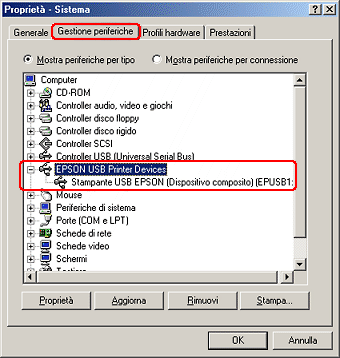 Se i driver sono installati correttamente, nel menu Gestione periferiche apparirà la voce Periferiche di stampa EPSON USB.