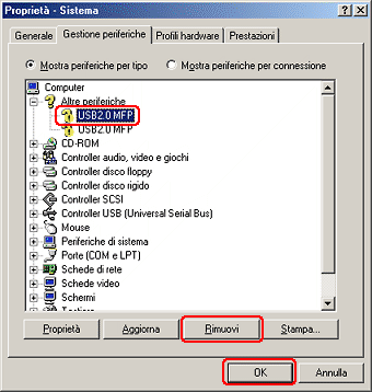 In Altre periferiche, selezionare USB 2.0 MFP o EPSON Stylus Photo RX620 e fare clic su Rimuovi. Quindi, fare clic su OK.