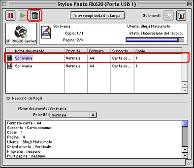 Nell'elenco Nome Documento, selezionare il documento in fase di stampa, quindi fare clic sul pulsante a icona Elimina per annullare il lavoro di stampa.